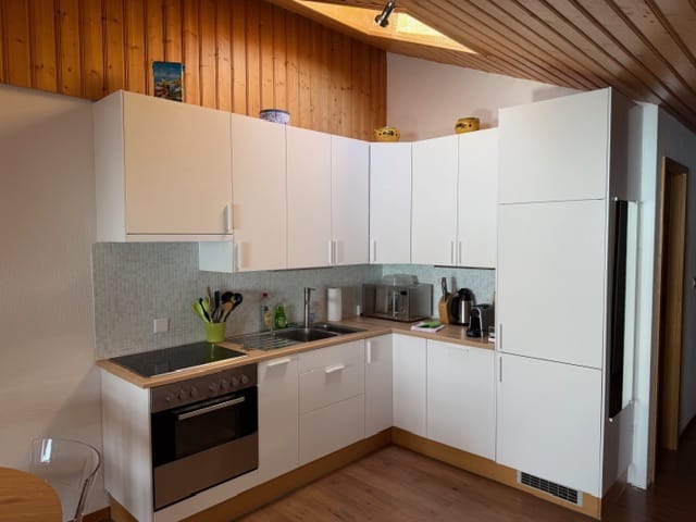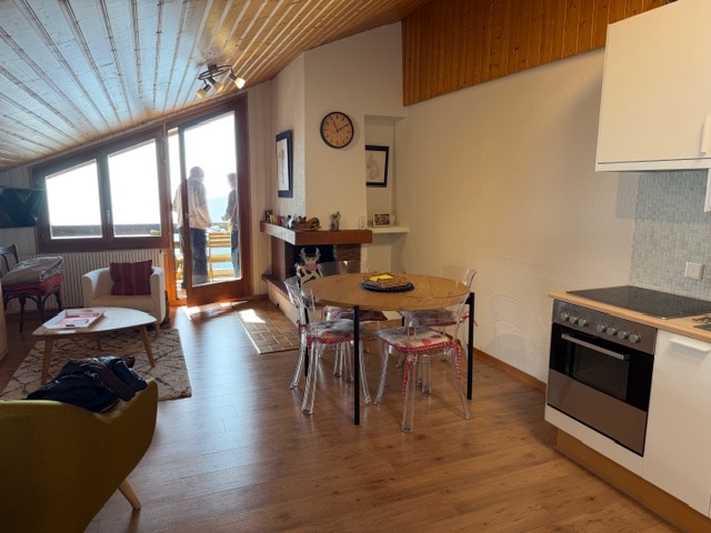 Magnifique 2.5 pièces meuble et équipé (vaisselle, linges, draps, etc…) à louer au mois, généreuse pièce à vivre, une grande chambre parentale, une petite chambre mansardée, sdb avec baignoire et wc séparé, balcon, magnifique vue sur la plaine et les Alpes. chf. 1’300.– mois. Place de parc à disposition.