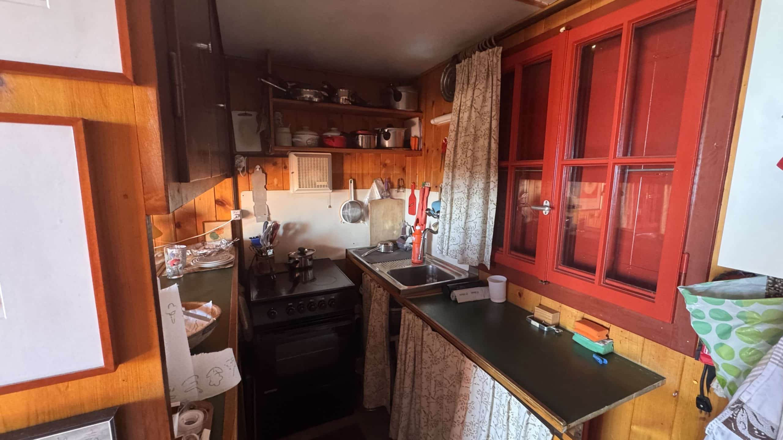 Une cuisine simple comprenant de nombreux rangements est présente.